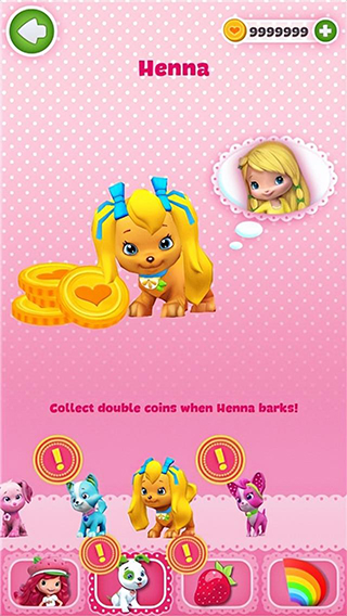 Wenna,黄色的小狗,解锁需要花费3950的金币,另外跟它对应的公主是黄色衣服和头发的公主,效果和之前的小狗一样也是让金币加倍。