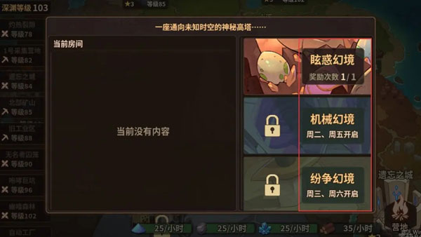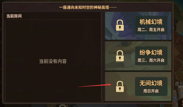 幻境之塔——多人副本,一共有4个副本。前三个副本周一至周六轮换开启,周日开启单独的一个副本,包含前三个塔的奖励。执行者可以创建房间进行关卡挑战,攻击力允许的情况下,可以选择单人闯关。