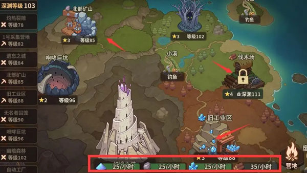 资源点——首次通过就可以解锁基建材料的自动产出功能,随着深渊层数的增加,每小时的产出也会上升。前期想要获得稳定的基建材料的来源,这几个资源点一定要开哦!小tips:升级营地里面的仓库,就可以提升基础建材的最大储存量!