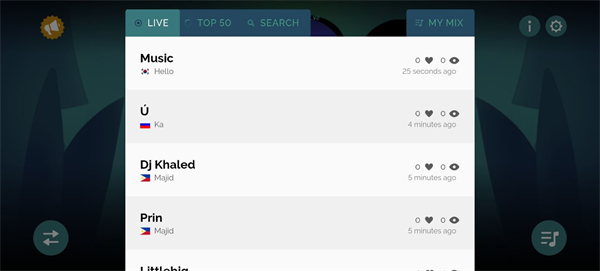 2、轻点左上角的LIVE,便能查看他人上传的歌曲以及全球排名前50的作品。