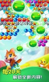 进入游戏后,玩家只需点击开始按钮即可开启冒险之旅。游戏提供了多个精心设计的关卡,玩家可以自由选择进入。操作方式非常简单,按住屏幕进行瞄准,松开手指即可发射泡泡。成功通关后,玩家将获得大量金币奖励,同时解锁下一关的挑战。完成特定数量的关卡后,玩家还能获得星星奖励,这些星星可以用来购买体力,让玩家能够无限畅玩游戏,享受不间断的欢乐时光。
