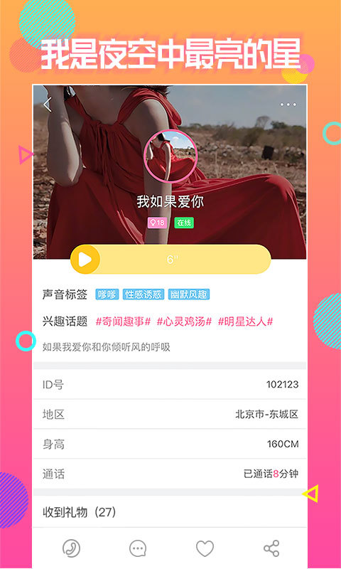 北方的汉子想找南方的妹子聊聊人生,地域匹配功能帮你快速找到心仪的对象。夜声是一款全球一对一类交友软件,支持多语言交流,打破地域限制。与市场上眼花缭乱的APP相比,我们只专注于一对一语音聊天,所以更专业!带给你前所未有的奇妙体验,清晰的音质让交流更顺畅。漫漫长夜,无心睡眠,内心深处的悄悄话和小秘密,想找个人倾诉,24小时在线用户随时陪伴。柔情的,甜美的,知性的,野性十足的,卡哇伊的,总有一款声优你,只要沉浸在她们独具一格的风情中,就是莫大的享受。三千佳丽已在线,还等什么?个性标签系统让你快速了解对方的兴趣爱好。