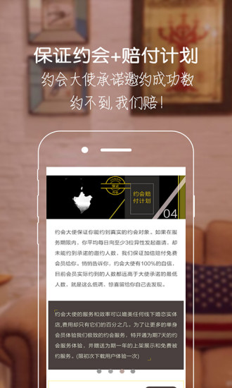 约会保证计划:仅需19元起即可体验,我们承诺至少帮您成功约见1位心仪对象,若未达成将给予10倍赔付。