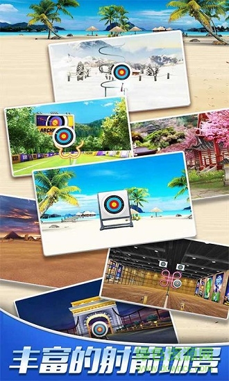 多样化的射箭场景包括茂密的森林、专业的射箭场、阳光沙滩、神秘金字塔和冰雪覆盖的极地等;