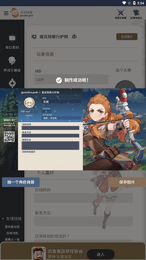 《原神旅行者护照》是一款以《原神》为灵感创作的模拟休闲同人小游戏。在这款游戏中,玩家可以亲手打造属于自己的原神风格名片,就像一本专属于旅行者的护照,记录着你在提瓦特大陆的点点滴滴。游戏不仅能够展示你收集的角色信息、精美立绘和冒险历程,还具有极高的收藏价值,让你随时回顾自己的游戏旅程。操作界面简洁直观,玩法轻松有趣,非常适合在原神主游戏之余放松身心,体验不一样的乐趣。无论是想要展示自己的游戏成就,还是单纯享受创作的快乐,这款游戏都能满足你的需求。感兴趣的玩家不妨立即下载,开启一段全新的休闲冒险之旅!