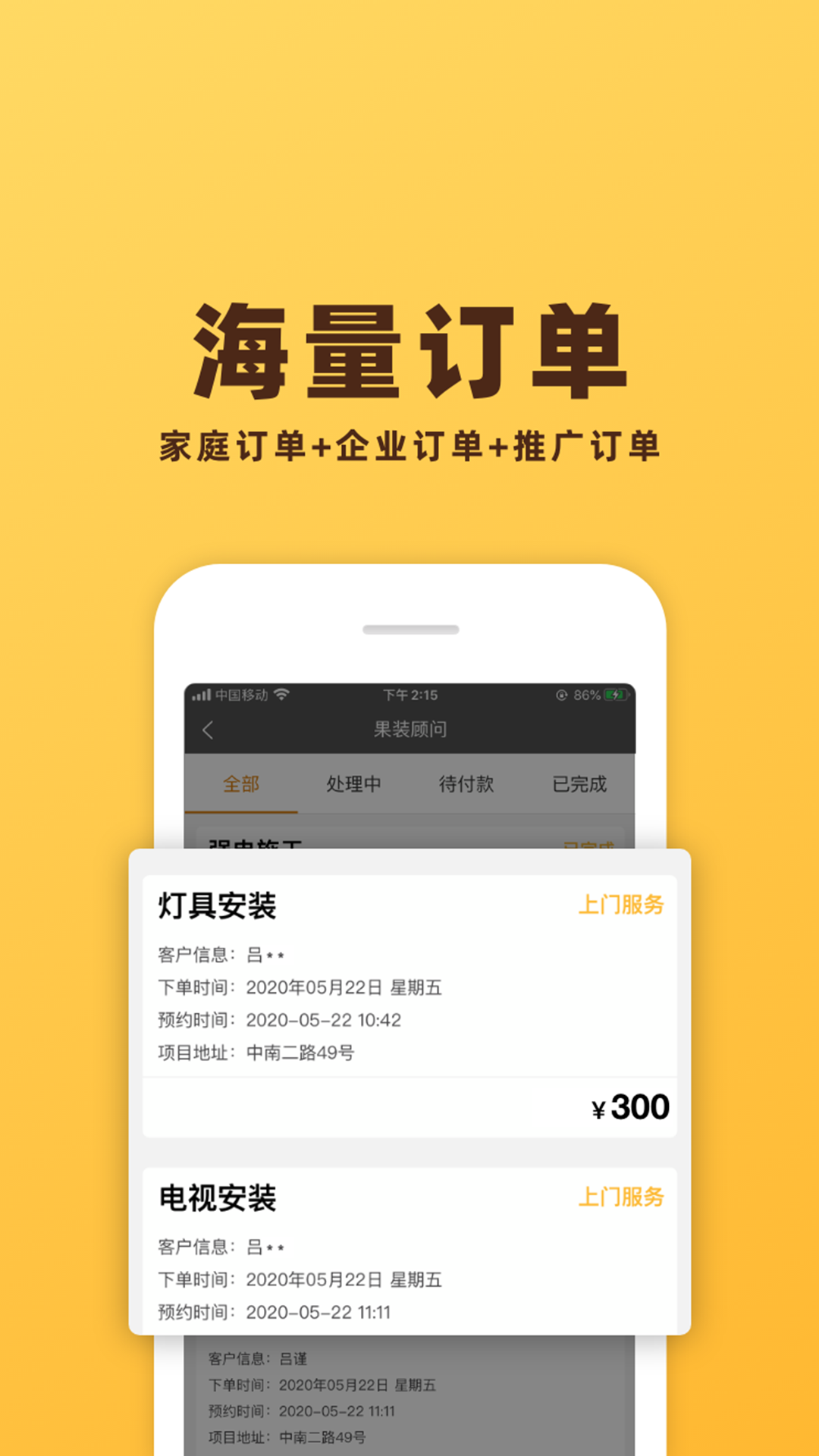 2、果装服务端,成为果装旗下工匠,即刻享受海量订单,一键抢单,轻松赚等服务,让您总有订单可接,根据您的个人习惯自动推送订单给您,在线接单又接钱哦