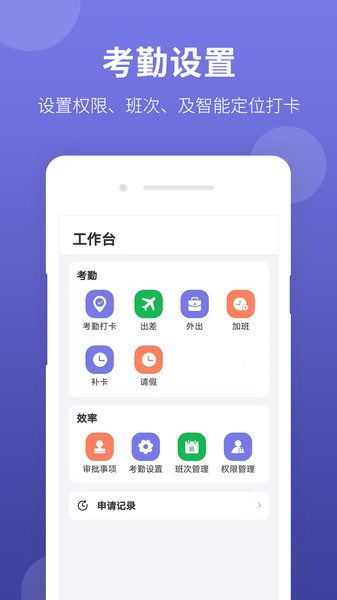 1、签到:多种签到方式精准定位;智能管理内外考勤,统计工时、迟到早退请假等状态