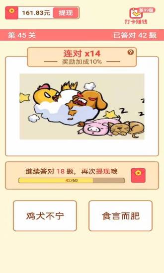 3、快乐猜成语是一款娱乐性质很强的趣味猜成语游戏。快乐猜成语赚钱的玩法模式有多种,快乐猜成语没有任何难度,快乐猜成语玩起来也是很容易上手,天天还有红包可以领