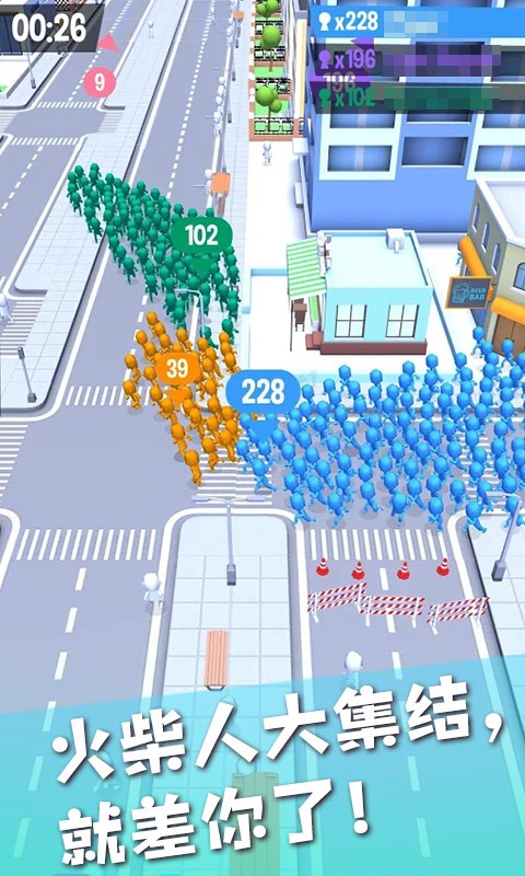 游戏拥有极具魔性的设定,看似清新的城市主题下暗藏激烈竞争。玩家需要将分散的火柴人快速集结成军,通过精妙的走位和战术安排来扩大势力范围。游戏支持全球玩家实时对战,你可以与来自世界各地的对手一较高下。在限定时间内快速聚集人群是制胜关键,需要玩家具备敏锐的观察力和快速反应能力,才能在混战中脱颖而出,成为最后的赢家。