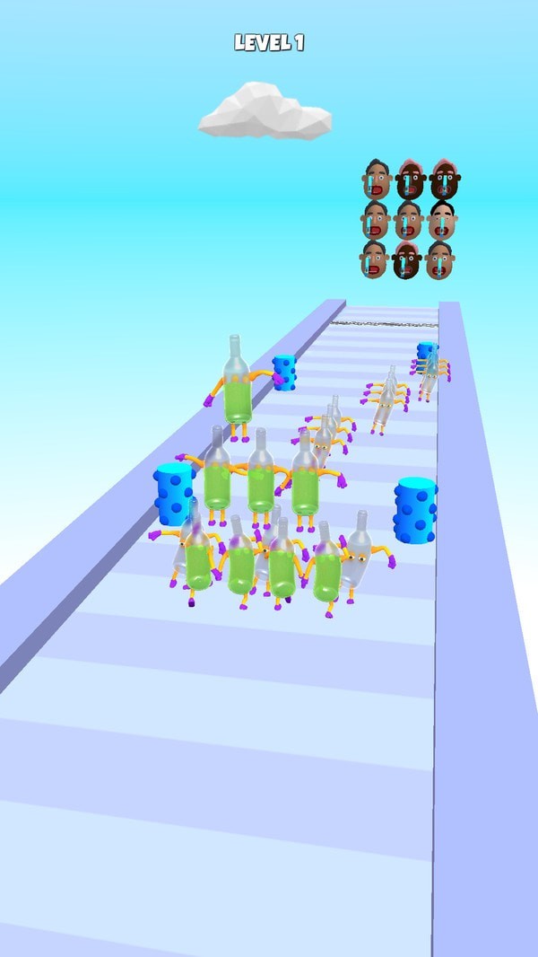 进入游戏后会看到一个非常夸张的瓶子,跑上去左右摇摆就能控制自己的瓶子了,这种独特的操控方式增加了游戏的趣味性。不要掉出赛道,否则会浪费时间,非常考验选手的反应能力,赛道边缘设计了许多有趣的互动元素。你需要灵活闪避,才能保证你的关卡安全顺畅,赢得最后的胜利,随着关卡推进,障碍物的种类和排列方式会越来越复杂多变。