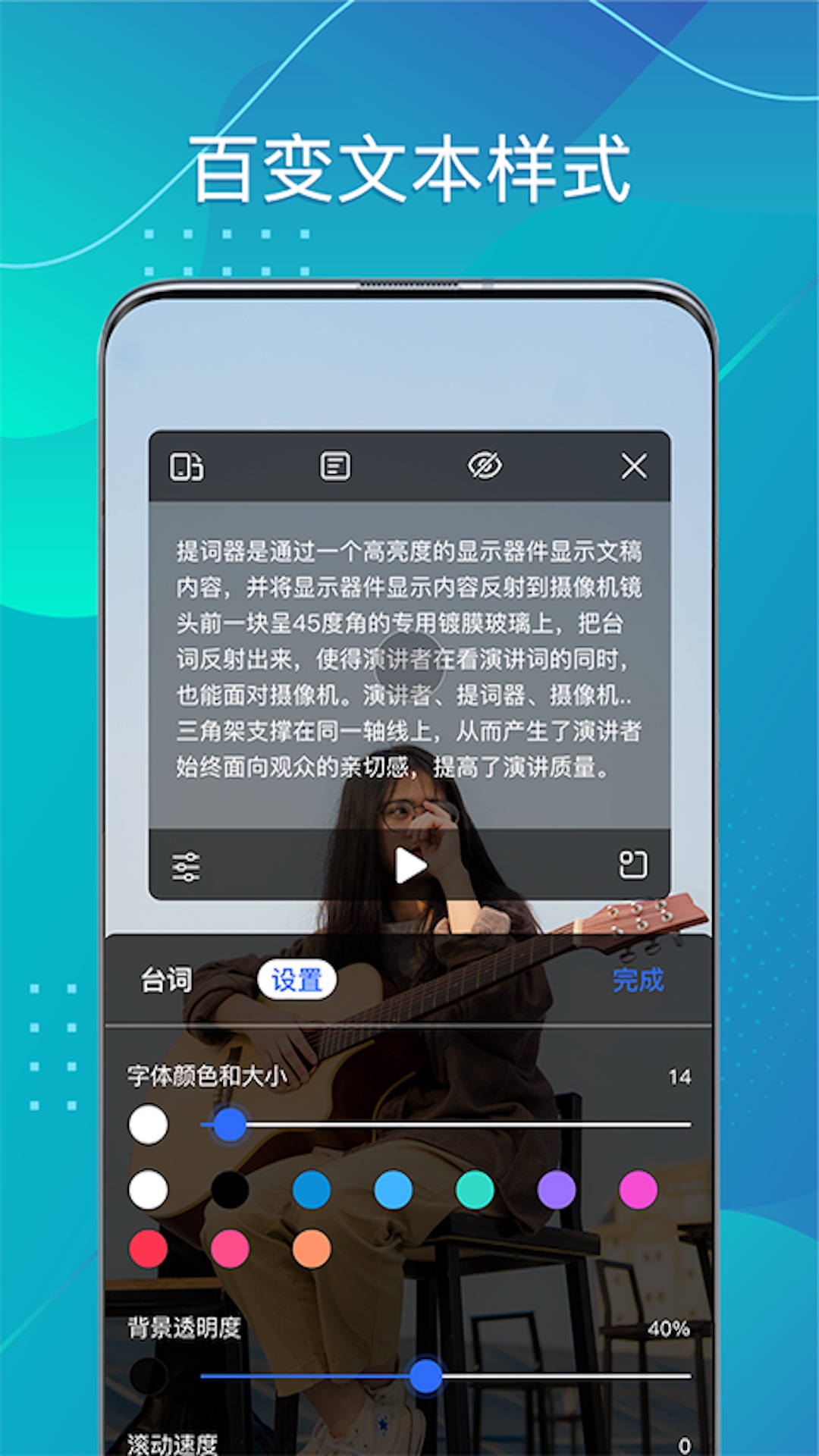一键切换功能让用户在不同演讲场景中快速调整显示模式,配合智能语速调节,确保台词与语速完美匹配。百搭悬浮题词窗口可自由调节透明度、大小和位置,既不影响拍摄画面又保证阅读舒适度。海量演讲素材库持续更新,包含开场白、过渡句、经典语录等实用内容。百变文本样式提供20+字体选择、多色高亮标记和字号分级,满足各类视觉需求。