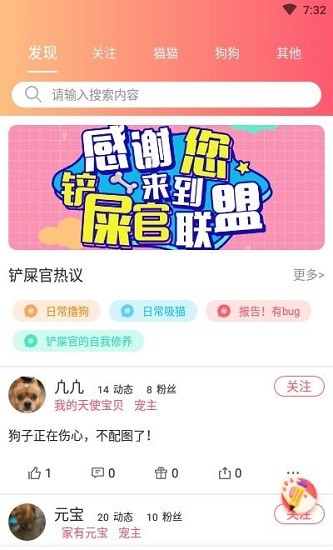 铲屎官联盟是一款专为宠物爱好者打造的社交平台,在这里您可以尽情分享爱宠的精彩瞬间。无论是萌宠的搞笑日常,还是专业的养护知识,都能在这个温暖的社区中找到共鸣。平台不仅提供宠物成长记录功能,还能让您结识志同道合的铲屎官朋友,共同探讨养宠心得。更有专业的宠物用品商城和线下活动预约服务,全方位满足您的养宠需求。快来加入这个充满爱心的宠物大家庭,记录您与爱宠的每一个珍贵时刻吧!