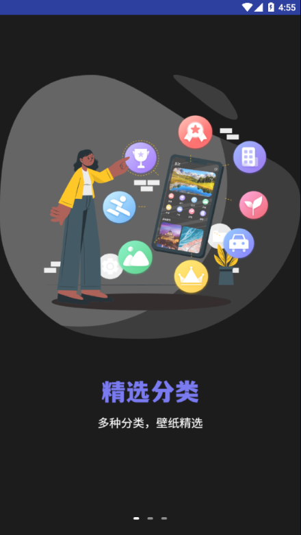 版块划分很清晰,可以直接根据标签来进行筛选,喜欢的话可以快速下载到手机中;独创的"一键换装"功能让更换壁纸只需3秒完成。可以很好的满足不同用户的需要,不管是什么手机型号都可以轻松设置。特别优化了适配算法,完美支持从5寸到7寸的各种全面屏设备,连折叠屏手机都能获得最佳显示效果。