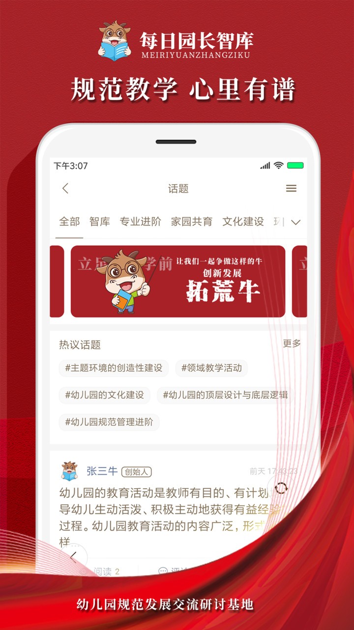 每日园长智库是幼儿园规范发展的专业交流研讨平台,其核心使命是帮助每一位幼儿园园长(包括经营者、创办者)实现规范化管理、标准化运营和科学化教学。通过系统化的知识体系和实践经验的分享,平台助力幼儿园实现质量提升的良性循环,推动办园水平持续进步。每日园长智库,让幼儿园管理有章可循,让办园质量稳步提升,真正做到"办园心里有谱"。