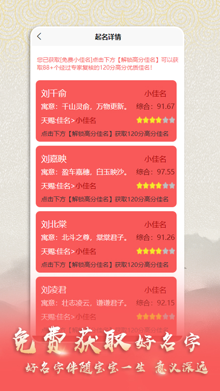 【宝宝起名】以易经五行为基础,将中国传统周易取名哲学融汇其中,为你筛选出适合自己生辰八字的好名字!千万不要小看名字的打分,说不定有的名字能够给你带来一生好福气,让你青云直上,富可敌国哦!系统采用科学的评分体系,从音韵、字形、寓意等多个维度进行综合评估。