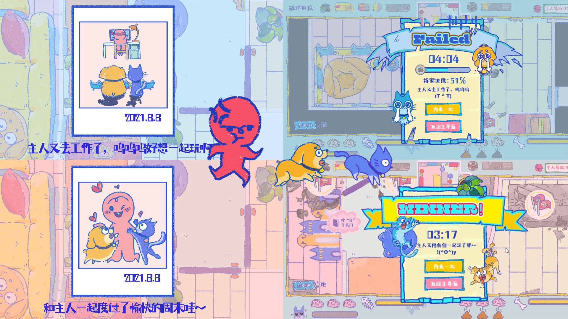 游戏的核心玩法围绕着"破坏"与"拖延"两大要素展开。玩家需要合理分配两只宠物的行动:猫咪负责牵制主人,狗狗负责制造混乱。每件被破坏的家具都会计入得分,同时拖延主人的时间也会获得额外奖励。游戏还设置了多种成就系统,比如"完美破坏者"(单次游戏破坏所有家具)、"时间管理大师"(让主人延迟回家超过5分钟)等,大大增加了游戏的可玩性和挑战性。游戏画面采用卡通渲染风格,破坏特效夸张有趣,音效设计也充满喜感,让整个破坏过程充满欢乐。