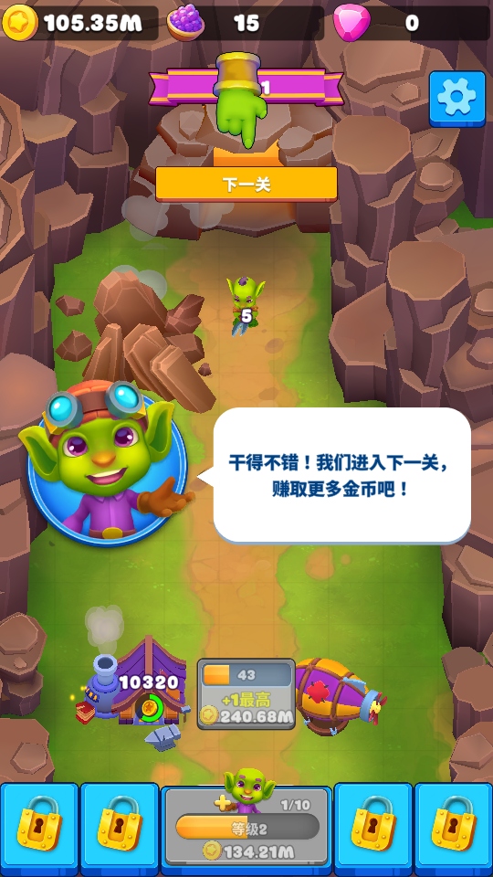 游戏的核心玩法之一就是合并系统,将相同等级的哥布林合并可以创造出更高级的精英矿工。这些升级后的工人不仅工作效率更高,还能解锁特殊技能。你的哥布林团队会自动进行矿脉勘探和开采工作,随着工人等级的提升,开采速度和资源获取效率都会显著提高。