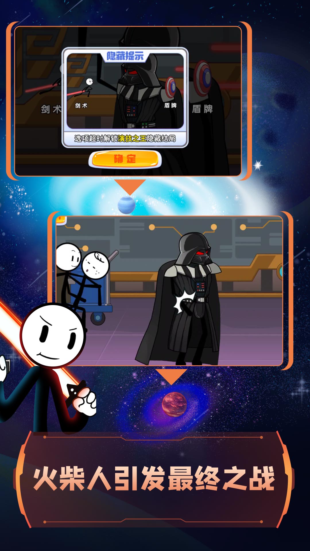 故事开始于火柴人驾驶飞船降落到一个陌生的星球。刚下飞船,火柴人就遇到了一个自称绝地武士大师的绿皮外星人。这个神秘的外星人不仅武力高强,还声称火柴人寻找的黄金面具实际上是邪恶之物,强迫火柴人将面具丢入火山口销毁。