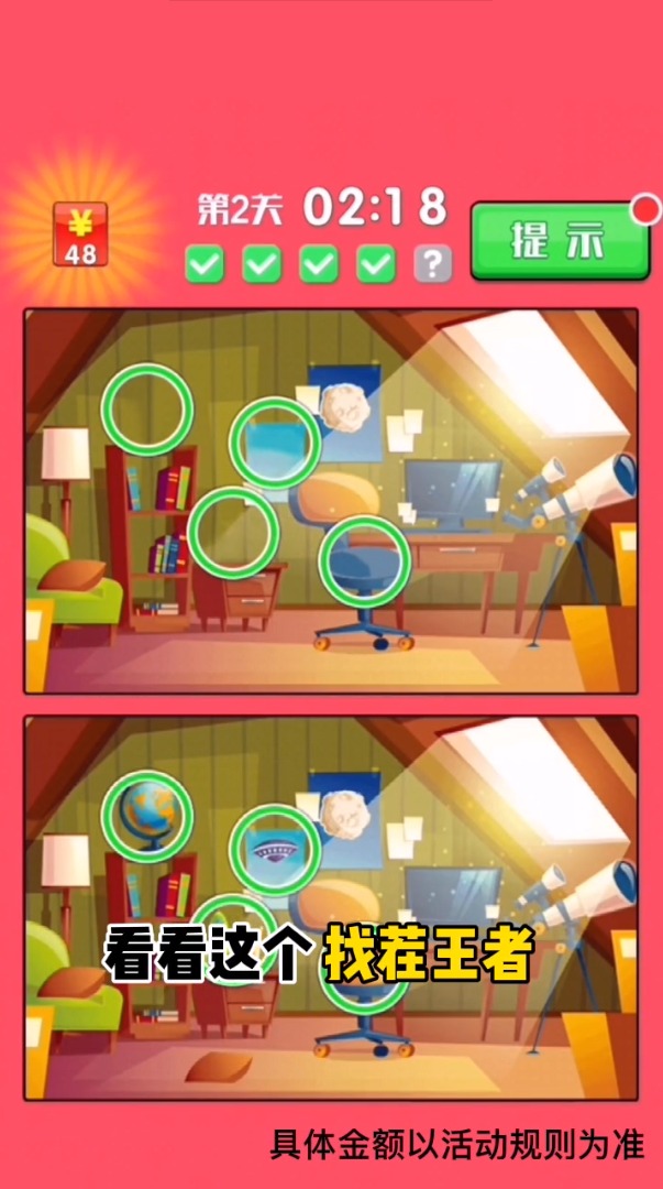 在《找茬王者秀》中,你可以尽情发挥自己的侦探细胞,挑战更多高难度的关卡任务,收获随机的红包奖励。游戏根据关卡难度设置了不同的奖励机制,难度越高,红包奖励越丰厚。此外,游戏还提供了许多不同类型的精美图片供你挑选,无论是唯美的插图还是趣味十足的卡通画面,都能让你在轻松减压的同时,感受到全民挑战的乐趣。无论你是找茬新手还是资深玩家,这款游戏都能带给你不一样的体验。
