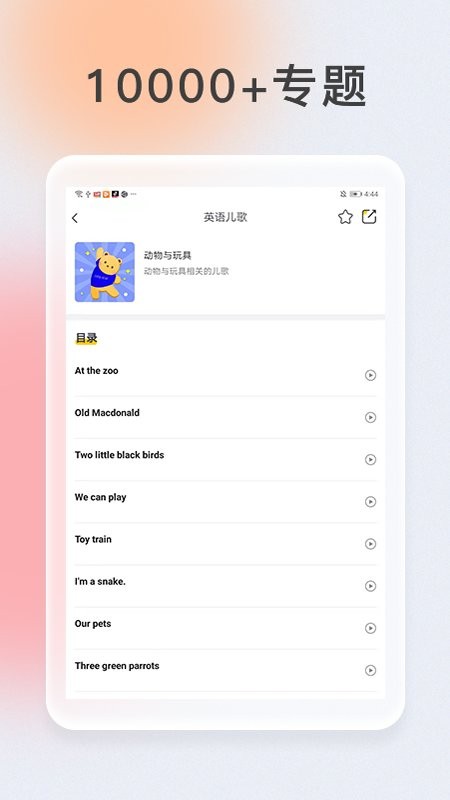 每月更新10000+专题精品内容,包括原创故事、经典童话、科普知识等,持续丰富内容库,陪伴孩子的每一步成长。
