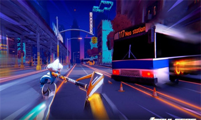 游戏中的跑酷画面充满了科幻感,炫目的光影特效与未来感十足的场景设计完美结合,让玩家仿佛置身于赛博朋克世界。高速移动时的动态模糊效果和粒子特效,将速度感表现得淋漓尽致。