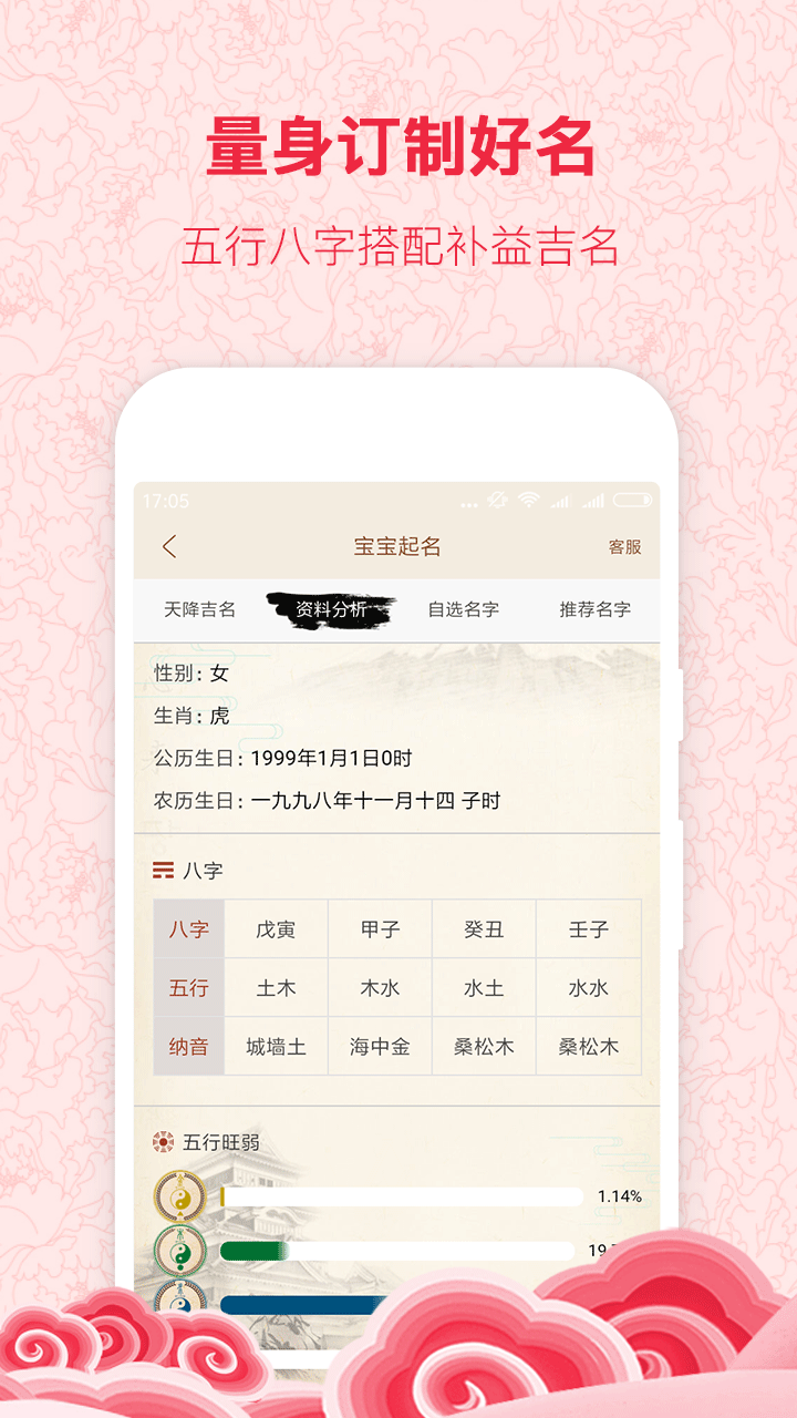 【宝宝起名】:富贵好名伴你一生,万年历测算出好名字,让你算命,幸福一生。系统内置超过10万个精选汉字库,支持按笔画数、五行属性、生肖宜忌等多维度筛选,提供名字评分、谐音检测等实用功能,确保每个名字都朗朗上口且吉祥如意。