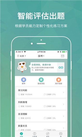 立足于考情,追求备考效率及考试应变性,通过对线上学习场景的深入研究,提出更符合线上备考的学习、训练方式;AI赋能对能力课、能力训练、阶段测评、试题模拟进行全方位技术追踪,提供多维度视角,辅助用户自我学习管理,规划具有针对性的提升路径。