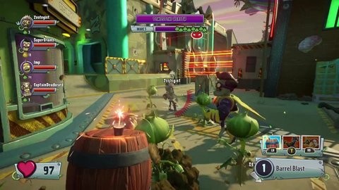 阵营选择:游戏分为植物与僵尸两大阵营,玩家可以根据喜好选择加入。每个阵营拥有多个角色,每个角色都有独特的技能和战斗风格,例如豌豆射手可以远程攻击,而僵尸士兵则擅长近战。阵营之间的对抗不仅考验玩家的操作技巧,还需要根据战场形势灵活调整战术,确保团队能够占据优势。