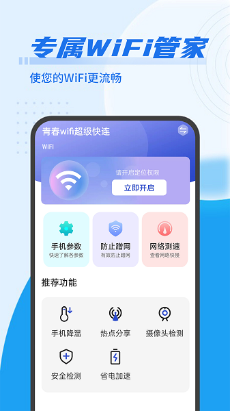 青春wifi超级快连是一款集多功能于一体的专业WiFi管理工具。除了基础的网络测速和一键连接功能外,它还具备智能安全检测、热点共享、设备管理等多种实用功能。通过先进的网络优化技术,该应用能显著提升网络连接速度和稳定性,有效解决WiFi信号弱、网络卡顿等常见问题。同时,简洁直观的操作界面让各类用户都能轻松上手,真正实现随时随地畅享高速网络。