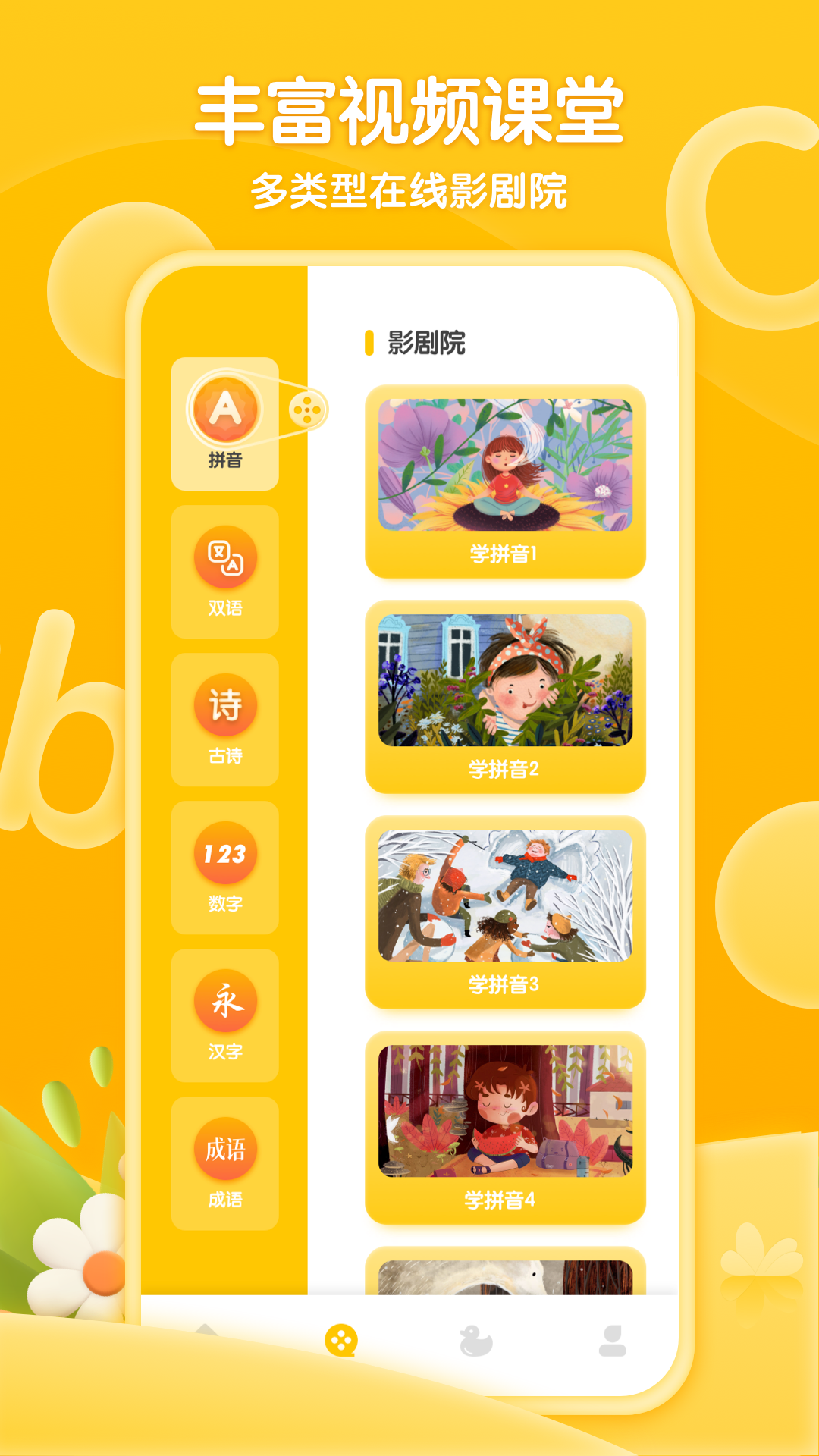 【影剧院】收录百首经典拼音儿歌,采用动画形式呈现,通过音乐节奏和视觉刺激提升宝宝认读拼音的兴趣和效率。