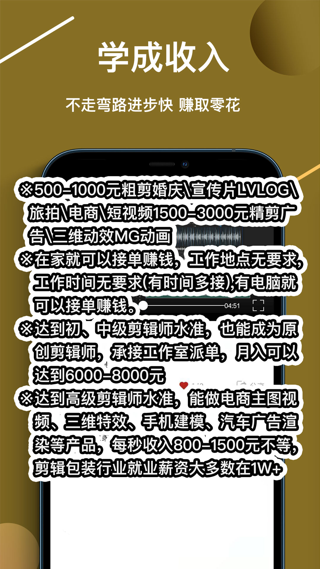 速学视频剪辑,零基础入门后期,教你用声音赚钱;平台独创"边学边赚"模式,学员在学习过程中就能接到真实剪辑订单。在家也能做,无需辞职;灵活的学习和工作时间安排,特别适合上班族和自由职业者。学成收入,不走弯路进步快,赚取零花;平台提供完善的接单渠道和作品展示空间,帮助学员快速建立个人品牌。适合人群,把兴趣变为职业,告别死薪资;系统化的职业发展路径规划,让学员从爱好者成长为专业剪辑师。