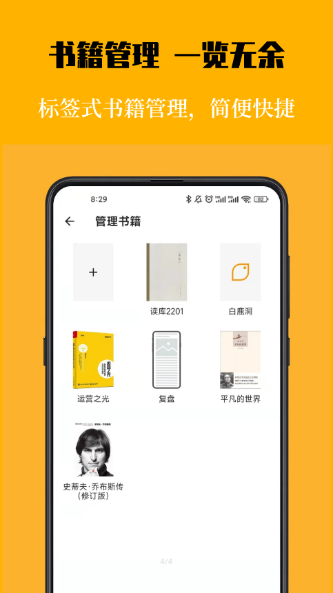 书籍管理一览无余 标签式书籍管理,简便快捷 支持多维度的智能分类,可按主题、阅读进度、重要程度等多重条件交叉筛选,书架管理从未如此清晰。