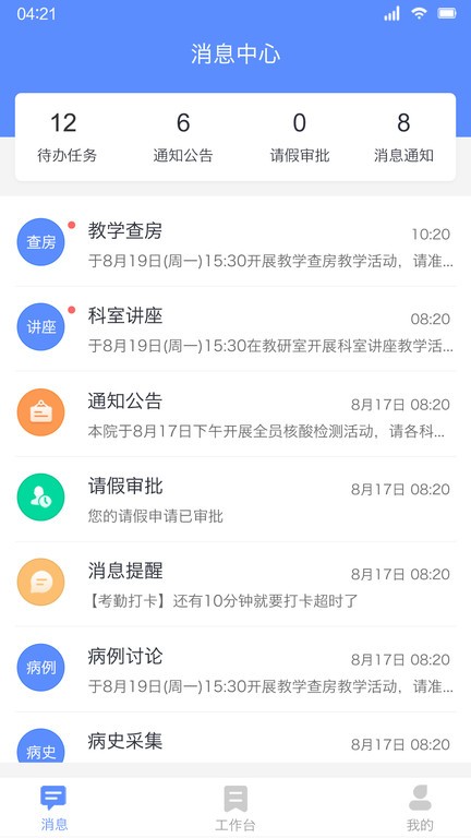 平台内置的智能消息中心可以实时推送各类教学通知和更新信息,确保用户第一时间获取最新动态。教学查房功能支持关键词快速检索,让查房任务变得简单高效。此外,平台还提供完善的实习过程记录功能,带教老师可以随时跟进学生实习情况,确保教学质量。