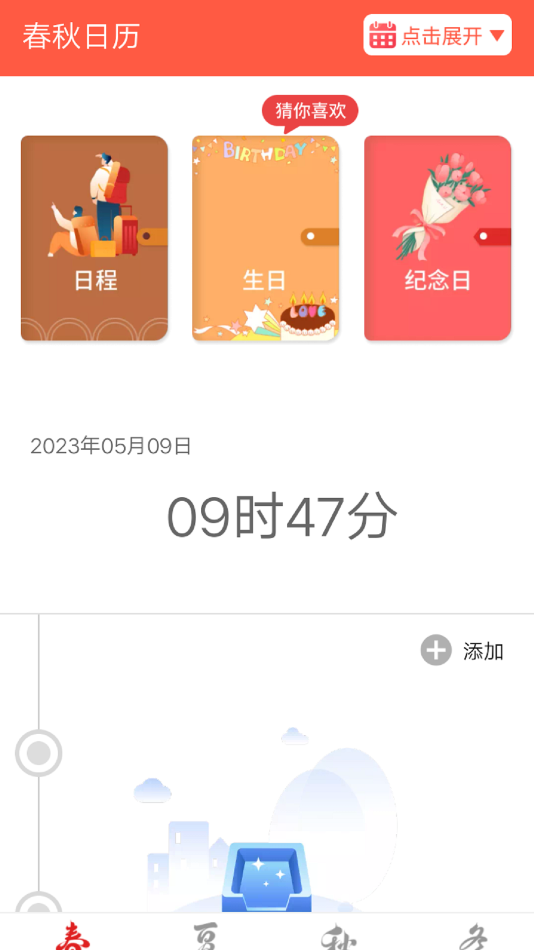 春秋日历不仅具备基础的日历功能,还特别加入了纪念日提醒、生日管家等实用功能。在功能设计上,软件内容全面丰富,能够满足用户对日历应用的各种需求。用户可以轻松查看每天的节日、节气信息,还能记录和管理个人日程安排。软件支持农历和阳历对照显示,让用户随时了解中国传统节气变化,是日常生活和节日规划的好帮手。