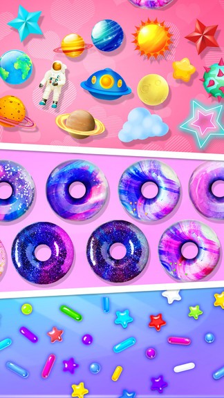 游戏提供了丰富多样的玩法内容:首先,玩家需要掌握油炸甜甜圈的技巧,控制油温和时间以获得完美口感;其次,游戏内置了上百种星空主题装饰品,包括星云糖粉、行星糖珠和银河巧克力碎片等;玩家还可以自由调配各种原料,通过物理搅拌创造出独特的纹理效果;完成制作后,不仅可以虚拟品尝美味,还能将作品分享给好友;最后,游戏特别设计了星空酱料系统,玩家可以调配出发光特效的梦幻酱汁,为甜甜圈增添神秘光彩。