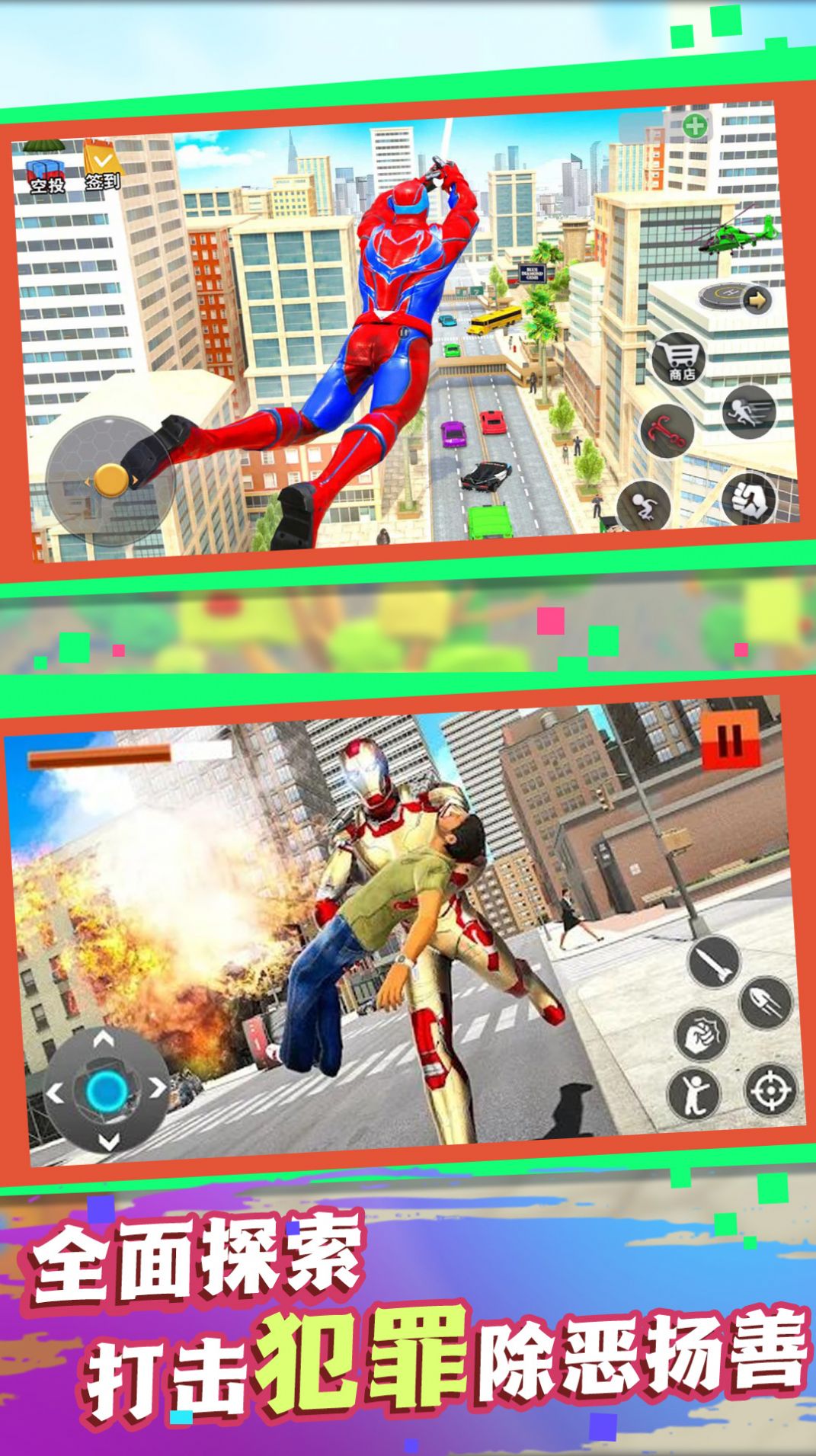 游戏采用智能导航系统,左上角的小地图会实时显示犯罪热点和敌人分布,帮助玩家快速锁定目标。操作方面采用直观的触控设计,通过滑动屏幕就能完成飞行、瞄准、射击等动作,战斗体验行云流水。特别值得一提的是飞行系统的设计,玩家可以巧妙利用飞行状态穿越复杂地形,甚至在空中完成华丽的战斗连招。游戏还设置了丰富的任务系统,虽然部分高难度挑战颇具考验,但完成后的丰厚奖励能让战衣性能获得质的飞跃。