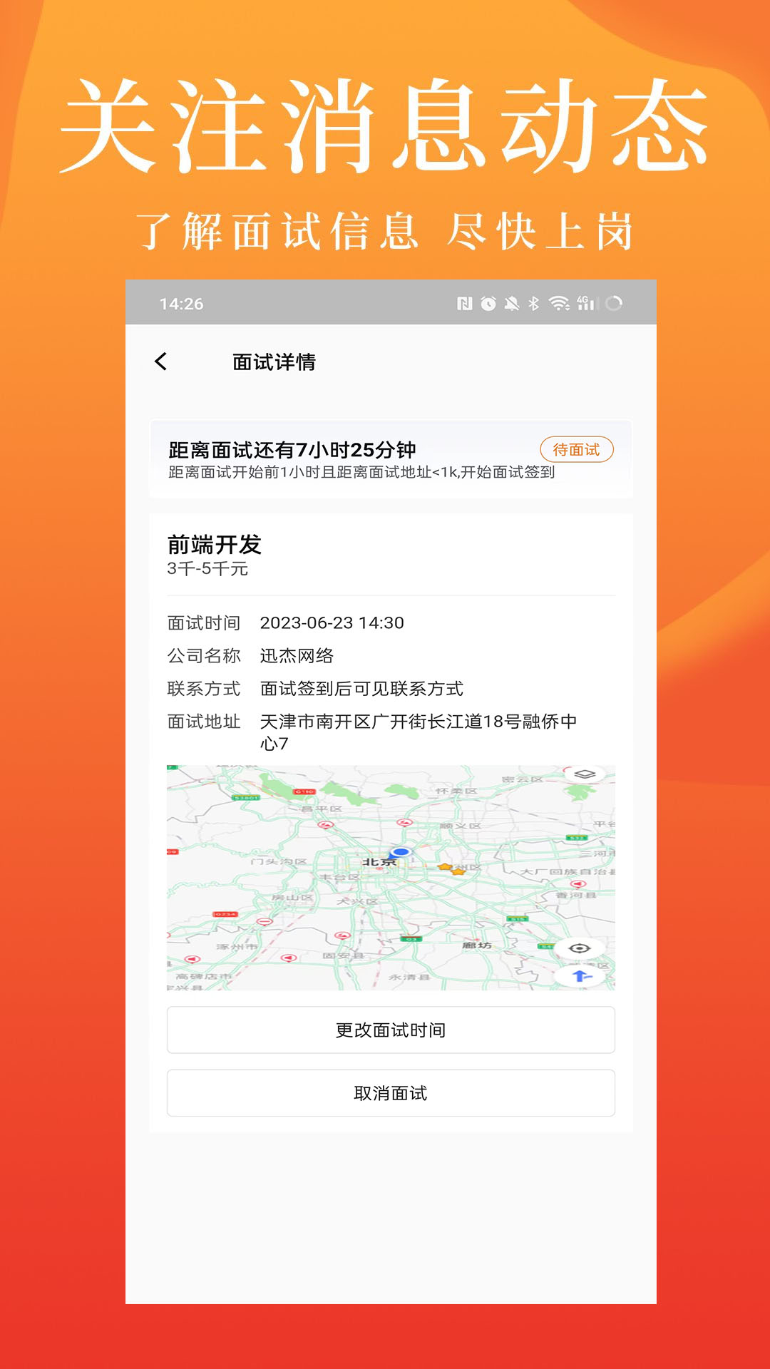 求职动态:实时追踪职位信息和求职进度,随时掌握最新面试通知和上岗机会,让您不错过任何优质工作机会。